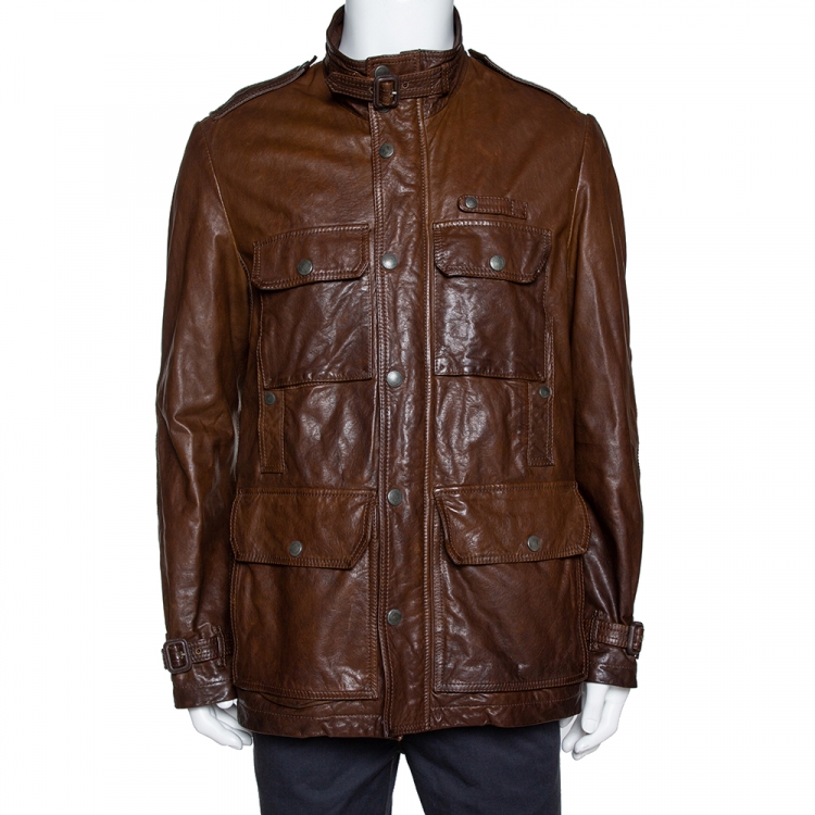Pre Owned جاكيت بربري أزرار أمامية جلد بني مقاس كبير (لارج)