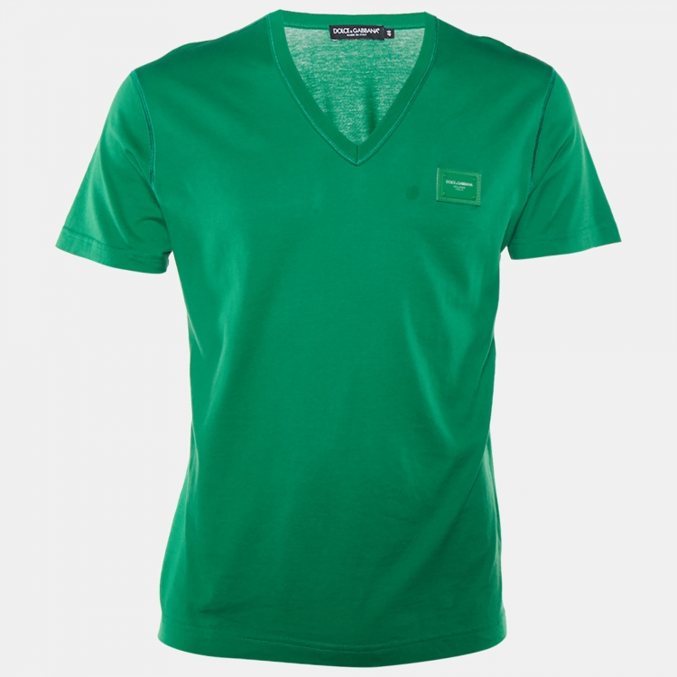 Dolce & Gabbana Green Cotton Knit Logo Plaque Detail V-Neck T-Shirt S