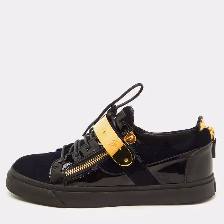 حذاء رياضي جوسيبي زانوتي مخمل أزرق كحلي/أسود وجلد براءة اختراع سحابين منخفض من الأعلى مقاس 41