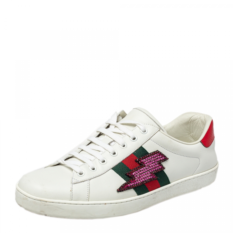 Pre Owned حذاء رياضي غوتشي ايس كانفاس وجلد أبيض مزخرف حلية صاعقة برق كريستال منخفض �من أعلى مقاس 43.5