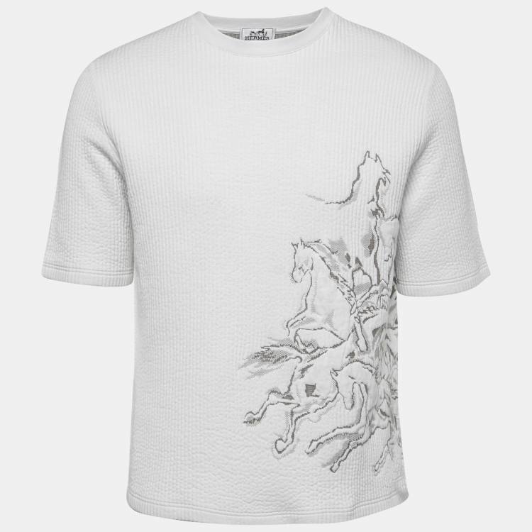 Pre Owned Hermes White Cavalcade Jacquard Cotton Rib Knit Crew Neck T-Shirt L