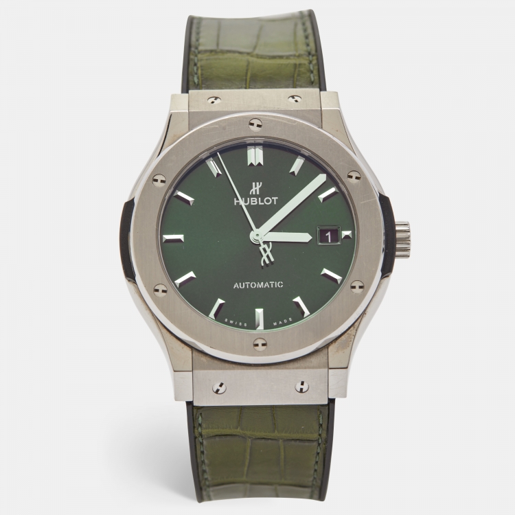 مملوكة مسبقًا Hublot Green Titanium Alligator Leather Rubber Classic Fusion 511.NX.8970.LR Men's Wristwatch 45 mm