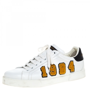 حذاء رياضي دولتشي أند غابانا منخفض من أعلى تفاصيل شعار جلد أبيض/ أسود مقاس 42.5