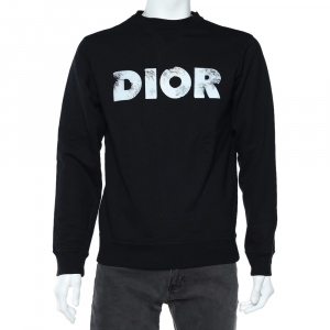 بلوفر ديور هوم قطن أسود بنقشة الشعار بالزهور برقبة مستديرة مقاس صغير جدًا - إكس لارج