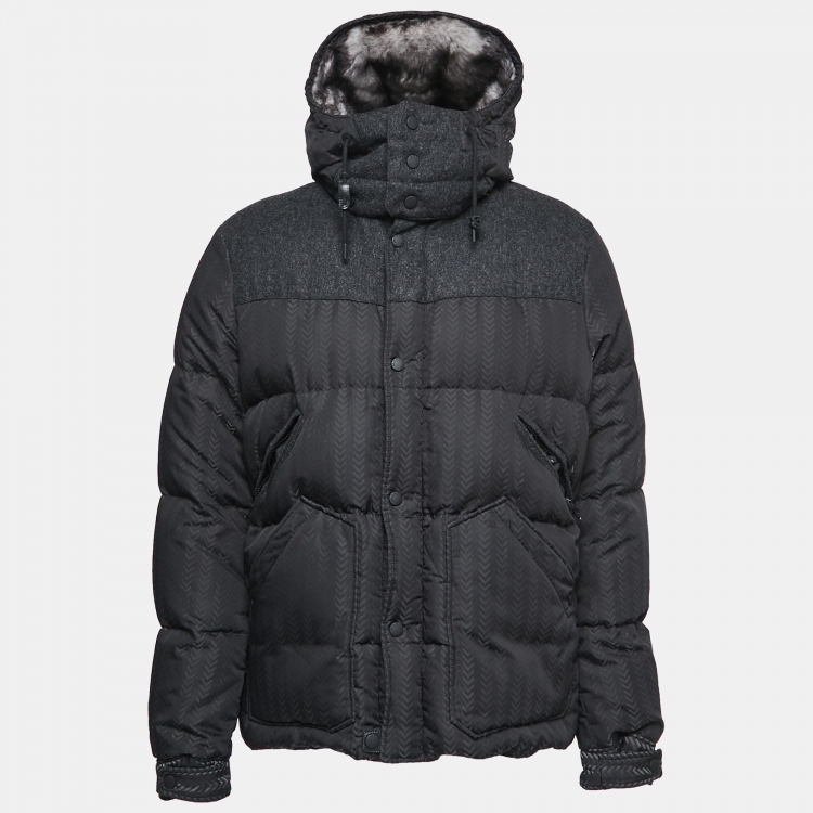 Pre Owned Moncler Black Chevron Patterned Synthetic Hooded Puffer Jacket