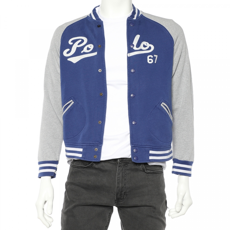 جاكيت بولو رالف لورين قمن تريكو أزرق ورصاصي بالشعار المطرز أزرار أمامية مقاس كبير - لارج