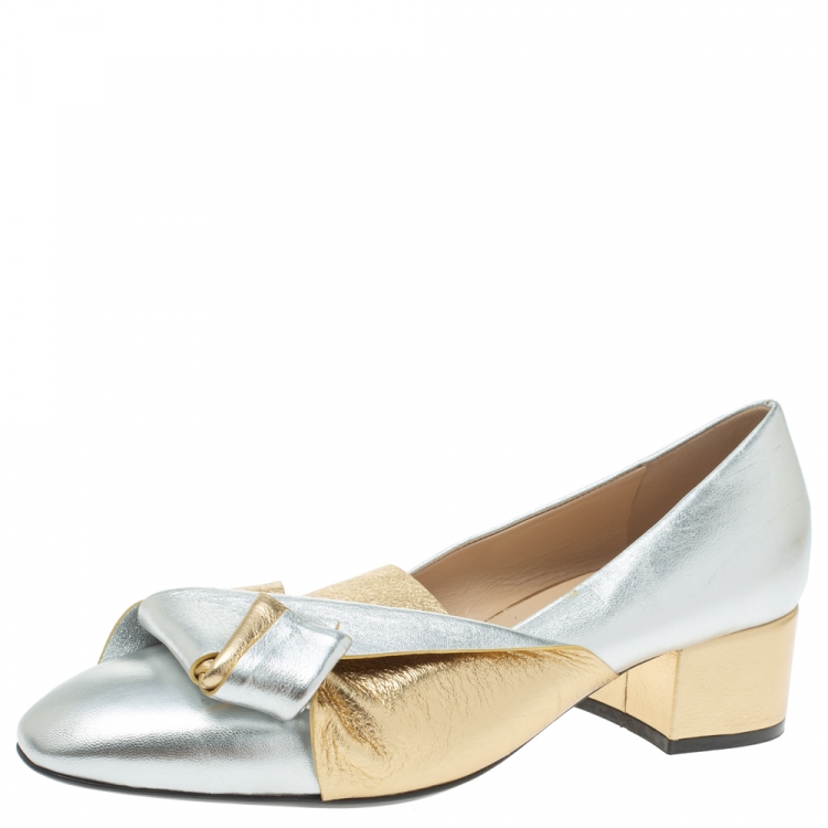 مملوكة مسبقًا N21 Gold/Silver Foil Leather Knotted Round Toe Pumps Size 37.5