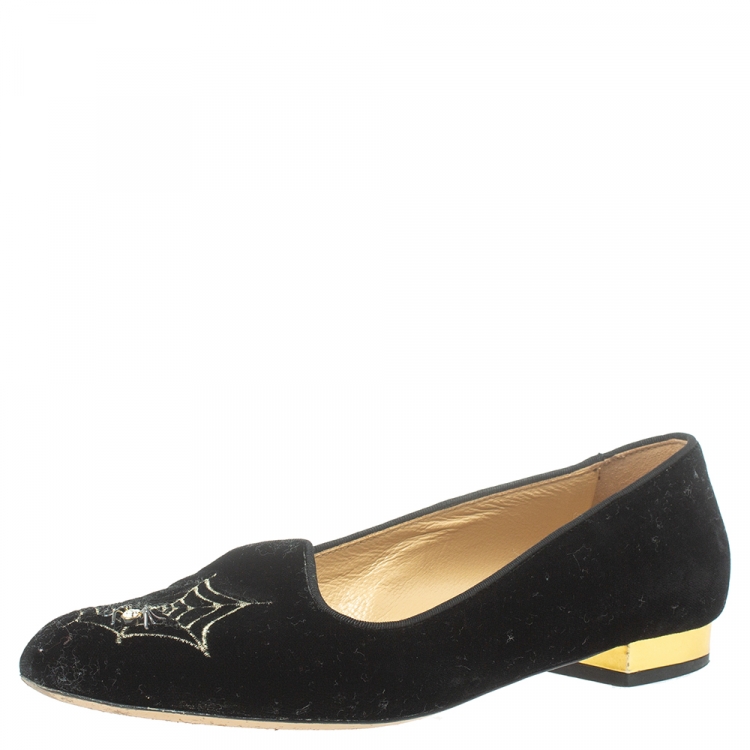 Charlotte Olympia Black Velvet Spider Embellished Smoking Loafers Size 38