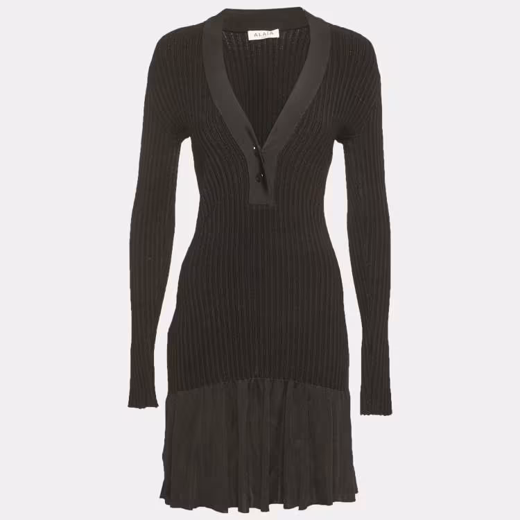 Pre Owned فستان علايا تريكو أسود لامع حريري مضلع بقصة واسعة قصير مقاس صغير