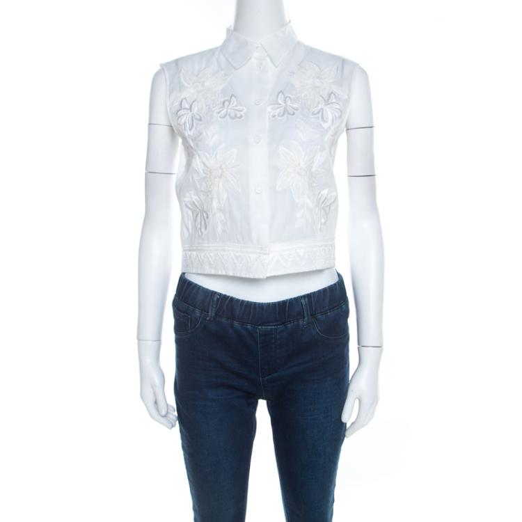 Pre Owned قميص ألبيرتا فيريتي قطن شفاف تطريز مورد بلا أكمام قصير كريمي S