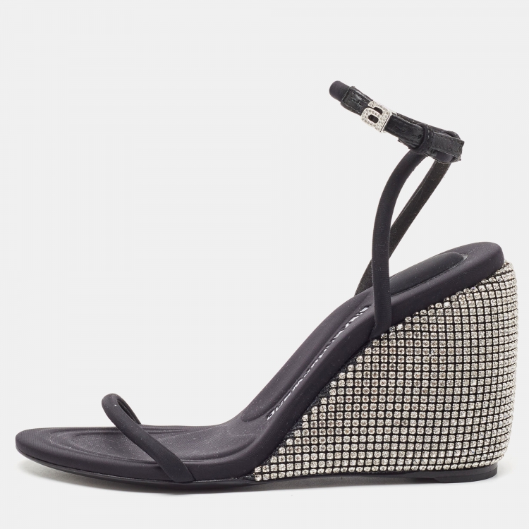 Alexander Wang Dahlia Black Satin Crystal Ankle Strap Wedge Sandals Size 38