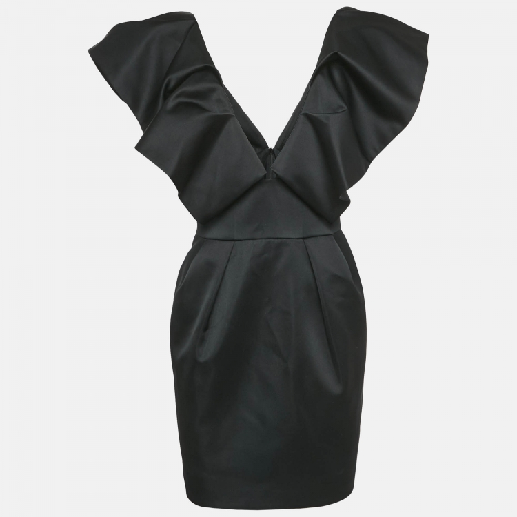 Pre Owned فساتين ألكسندر فوتييه بتصميم قصير من الساتان الأسود مع كشكشة برقبة على شكل V مقاس وسط (ميديوم)