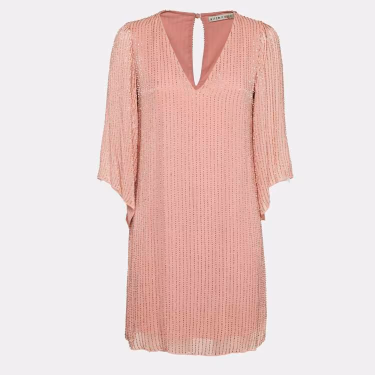 Pre Owned فستان آليس + أوليفيا وردي كريب مطرز بقصة رقبة V ميني مقاس صغير (سمول)