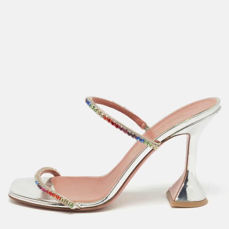 Pre Owned Amina Muaddi Silver Leather Crystal Embellished Gilda Slide Sandals Size 39