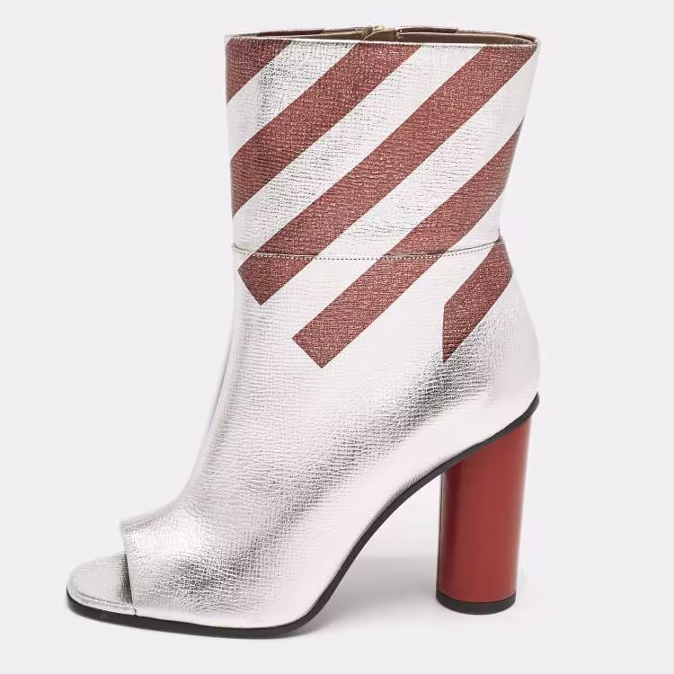 حذاء بوت أنيا هيندمارش فضي/خمري مخطط من الجلد بكعب مفتوح عند الأصابع وبطول الكاحل مقاس 40