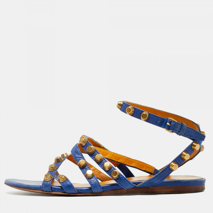 Pre Owned حذاء فلات بحزام للكاحل جلدي أزرق بالنسياغا مقاس 38