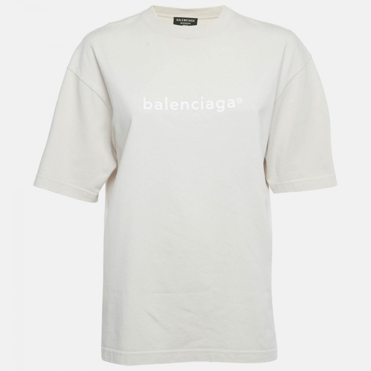 تي شيرت بالنسياغا قطن بيج مطبوع بالشعار عنق دائري مقاس صغير جدًا - إكس إكس سمول