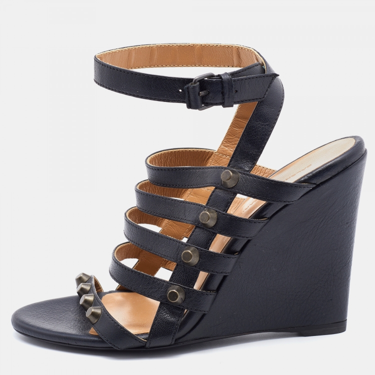 Balenciaga Black Leather Arena Studded Gladiator Wedge Sandals Size 37.5