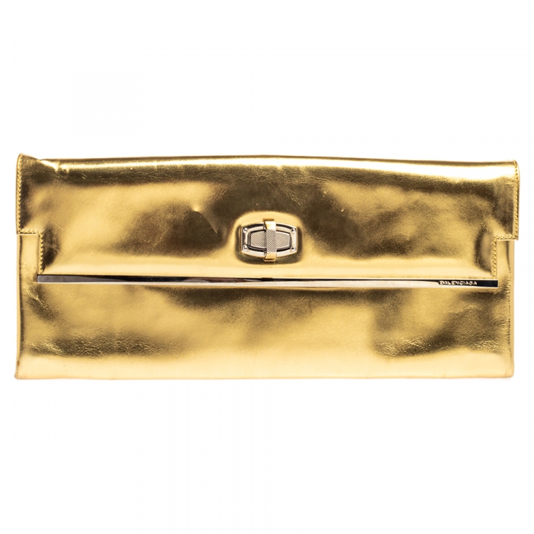 حقيبة كلتش بالنسياغا قلاب معدن قفل دوار جلد ذهبي ميتالك