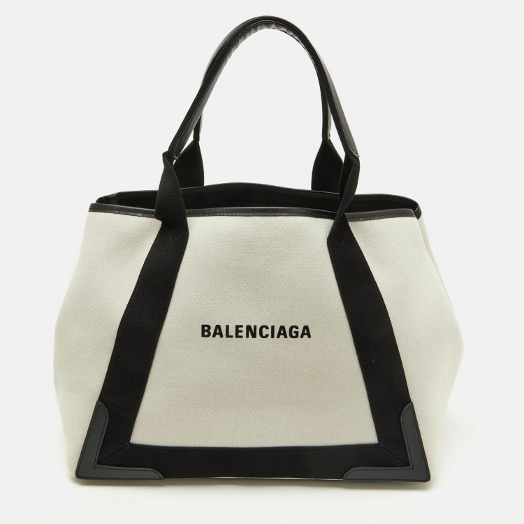 حقيبة يد بالنسياجا كاباس جلد وقماش أبيض/أسود بحري صغير