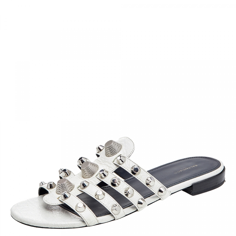 صندل سلايد فلات بالنسياغا ارينا جلد أبيض مرصع ترصيعات ضخمة مقاس 40
