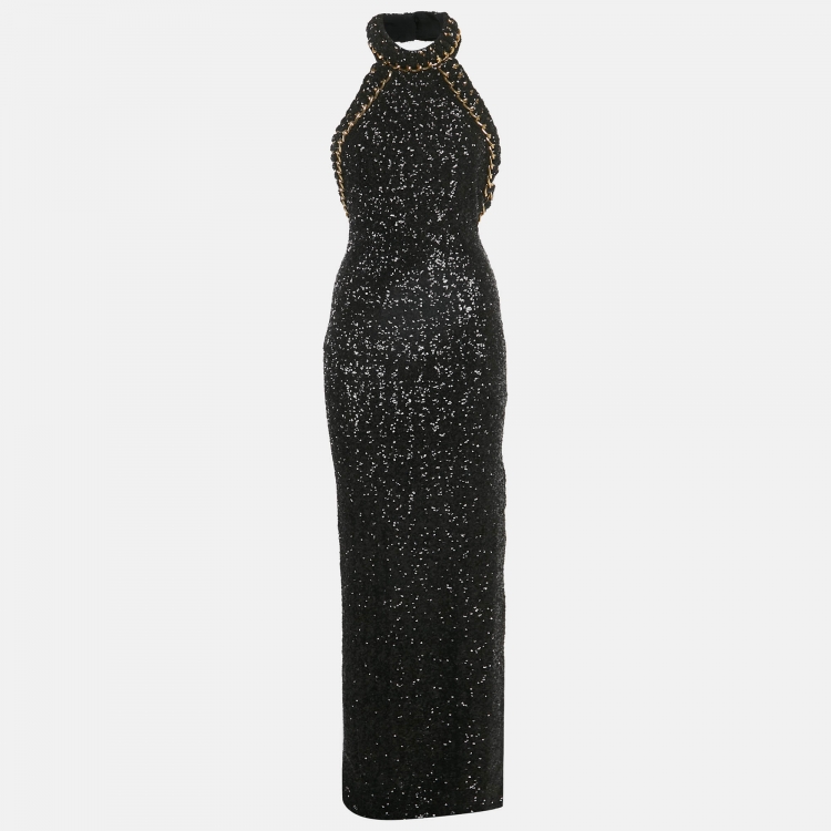 Pre Owned فستان ماكسي بالمان أسود بتفاصيل سلسلة برقبة هالتر ترتر بمقاس متوسط - ميديم