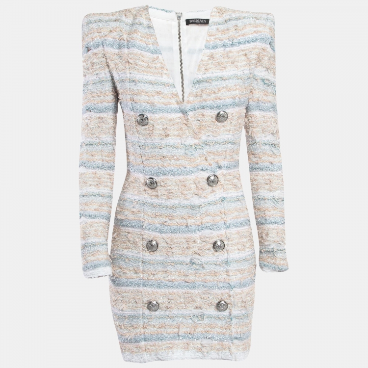 مملوكة مسبقًا Balmain White/Blue Metallic Bouclé-Tweed Button-Embellished Mini Dress M
