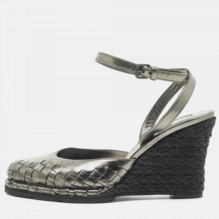 Bottega Veneta Metallic Intrecciato Leather Espadrille Wedge Ankle Strap Sandals Size 35