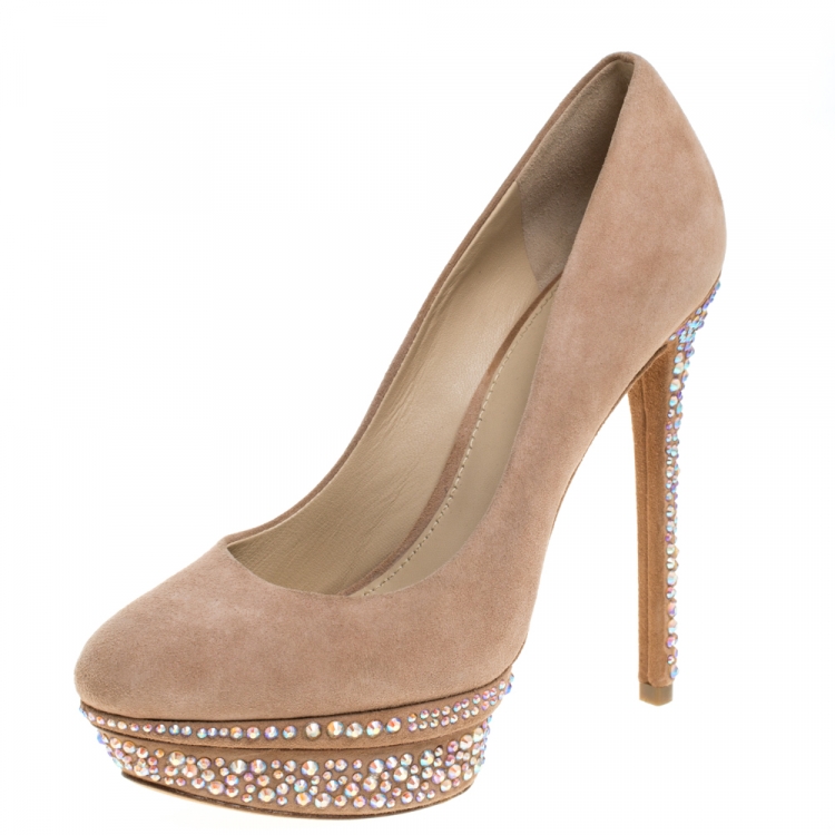 مملوكة مسبقًا حذاء كعب عالي براين أتوود "فرانسويز" مزخرف كريستال نعل سميك سويدي بيج مقاس 39.5