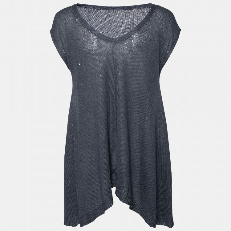 Pre Owned Brunello Cucinelli Grey Linen Knit Sequin Embellished Top L