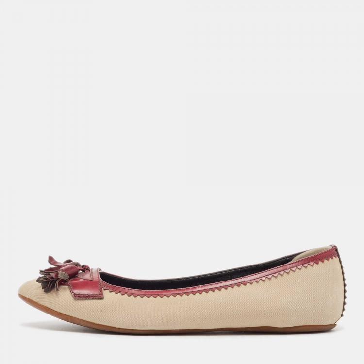 Burberry Beige/Burgundy Fabric and Leather Tassel Bow Ballet Flats Size 38.5