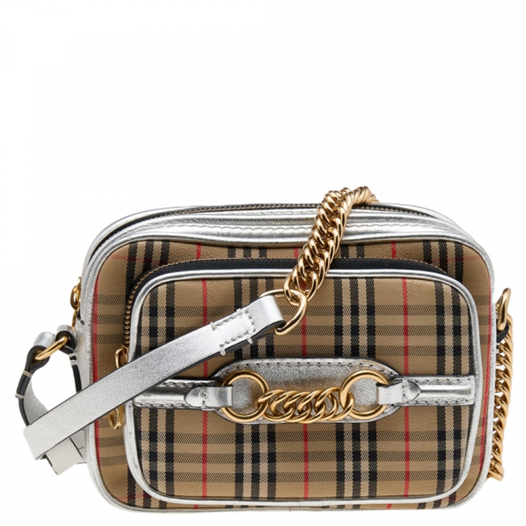 حقيبة كاميرا بربري لينك 1983 نايت جلد وكانفاس كاروهات بيج/فضي