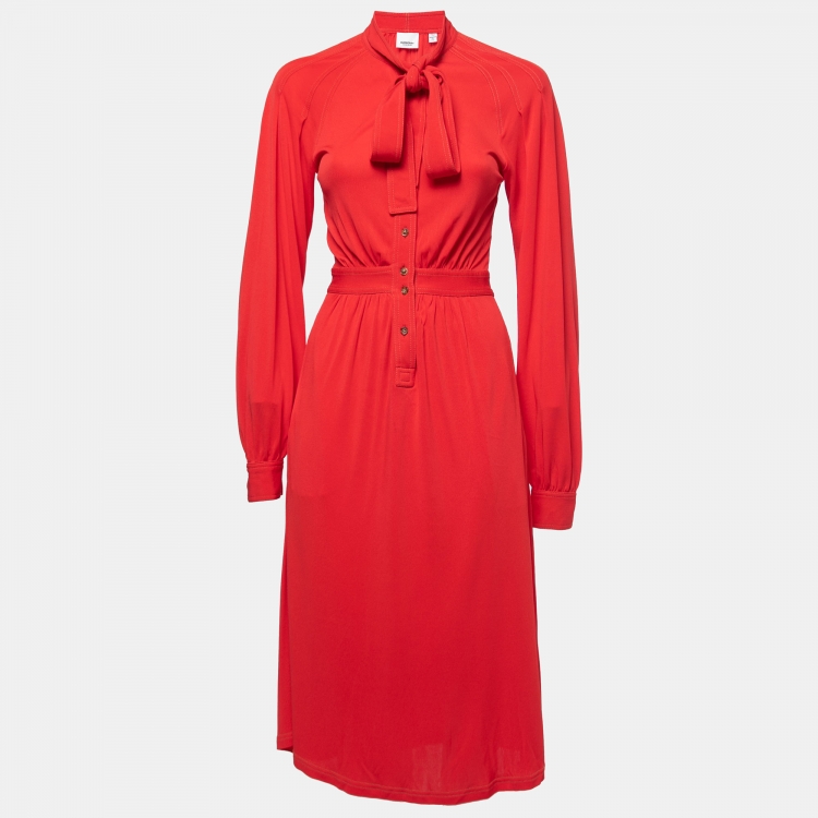 Burberry Red Jersey Button Front Neck Tie Detail Long Sleeve Midi Dress XS