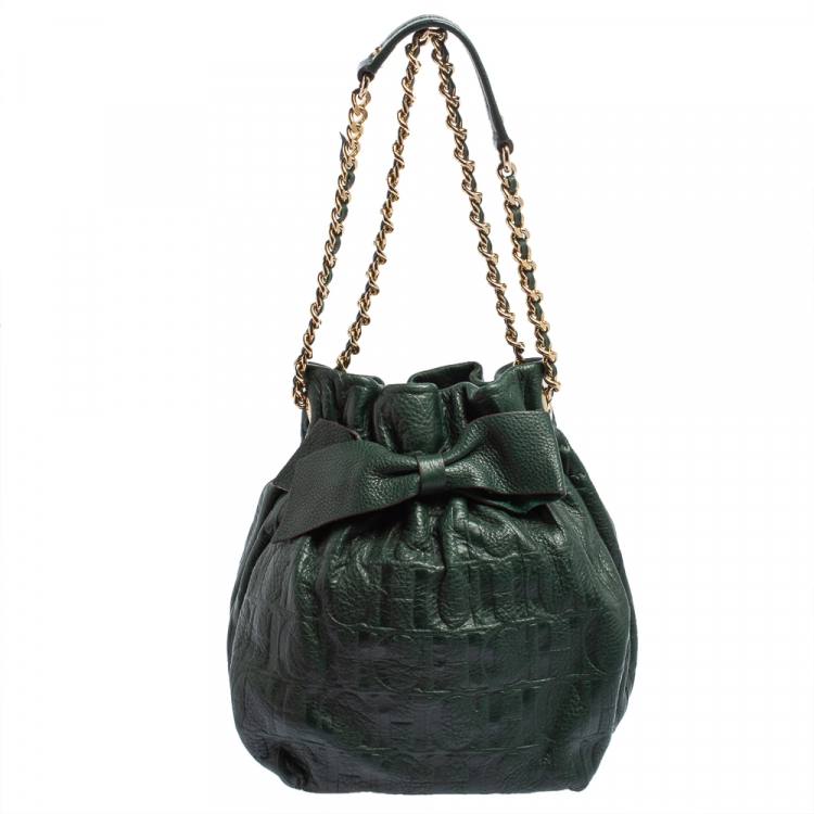 Pre Owned حقيبة كتف كارولينا هيريرا باكيت جلد مونوغرامي منقوش أخضر داكن بفيونكة