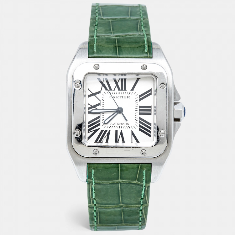 مملوكة مسبقًا ساعة يد رجالية كارتييه سانتوس 100 W20073X8 جلد تمساح أمريكي ستانلس ستيل بيضاء فضية 38مم