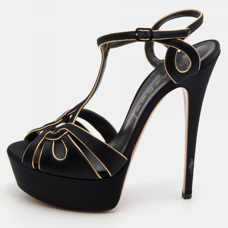 Casadei Black/Gold Satin and Leather Platform Sandals Size 37