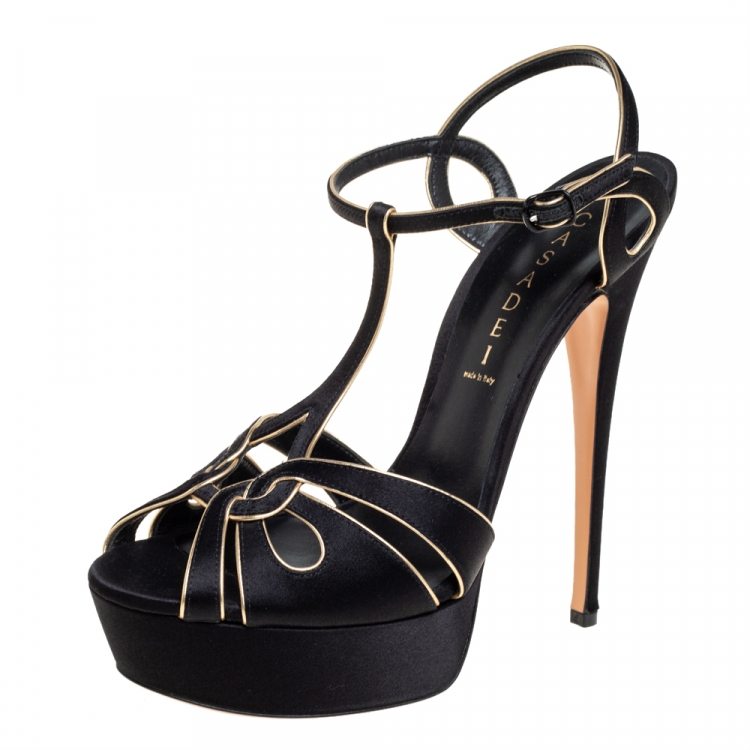 صندل كاسادي سير حرف تي ساتان ذهبي/أسود مقدمة مفتوحة نعل سميك مقاس 40
