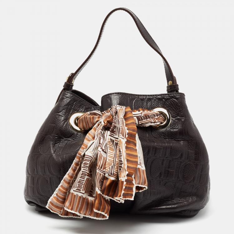 مملوكة مسبقًا حقيبة هوبو بوشاح سي أتش كارولينا هيريرا جلد منقوش مونوغرامي بني داكن