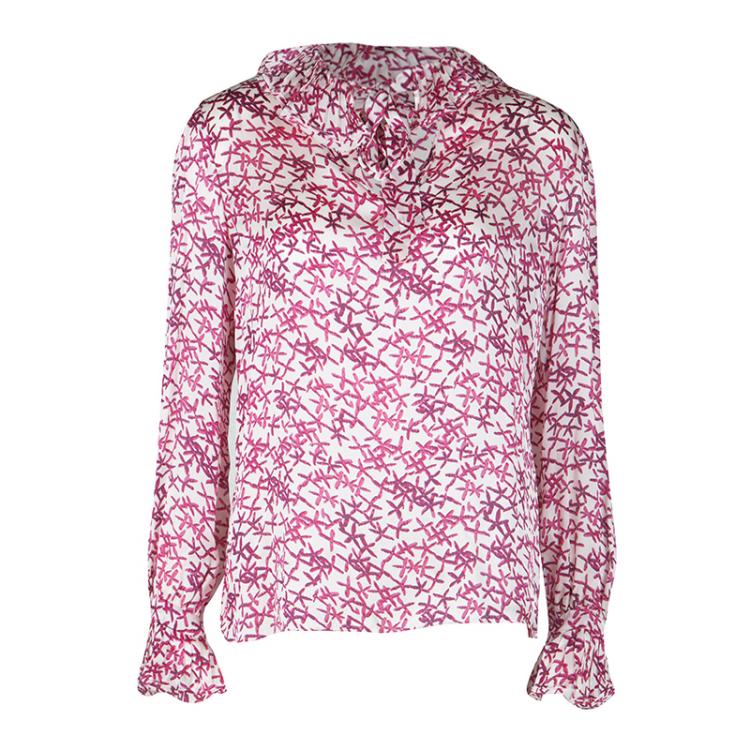 Pre Owned بلوزة سي أتش كارولينا هيريرا حرير أبيض ووردي مطبوع أكمام طويلة M