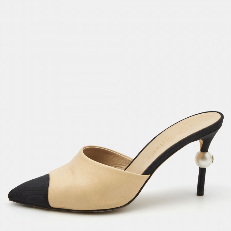 Chanel Beige/Black Leather and Canvas CC Faux Pearl Embellished Heel Mules Size 37