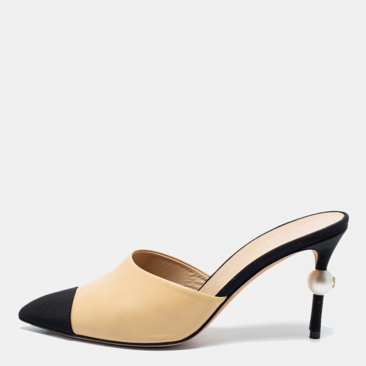 حذاء سلايد شانيل سي سي كانفاس وجلد بيج/أسود كعب مزخرف لؤلؤ مقاس 37