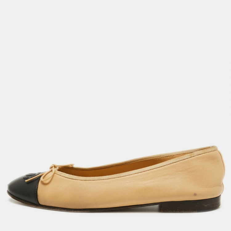 Chanel Beige/Black Leather CC Cap Toe Bow Ballet Flats Size 38