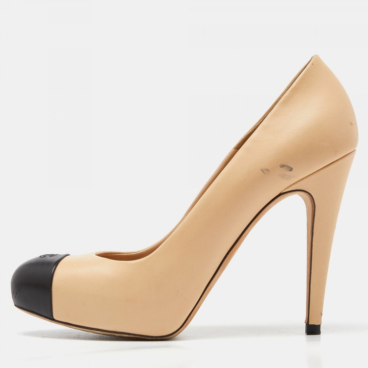 حذاء كعب عالي شانيل CC جلد أسود منقوش بمقدمة مستديرة مقاس 38.5