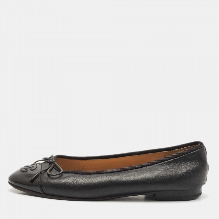 مملوكة مسبقًا حذاء باليه فلات شانيل فيونكة جلد أسود وبمقدمة برّاقة بشعار CC مقاس 35