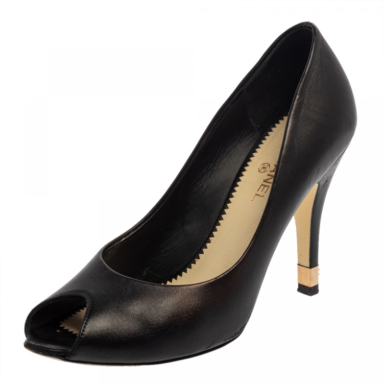 مملوكة مسبقًا حذاء كعب عالى شانيل مقدمة مفتوحة كعب سى سى جلد أسود مقاس 37.5