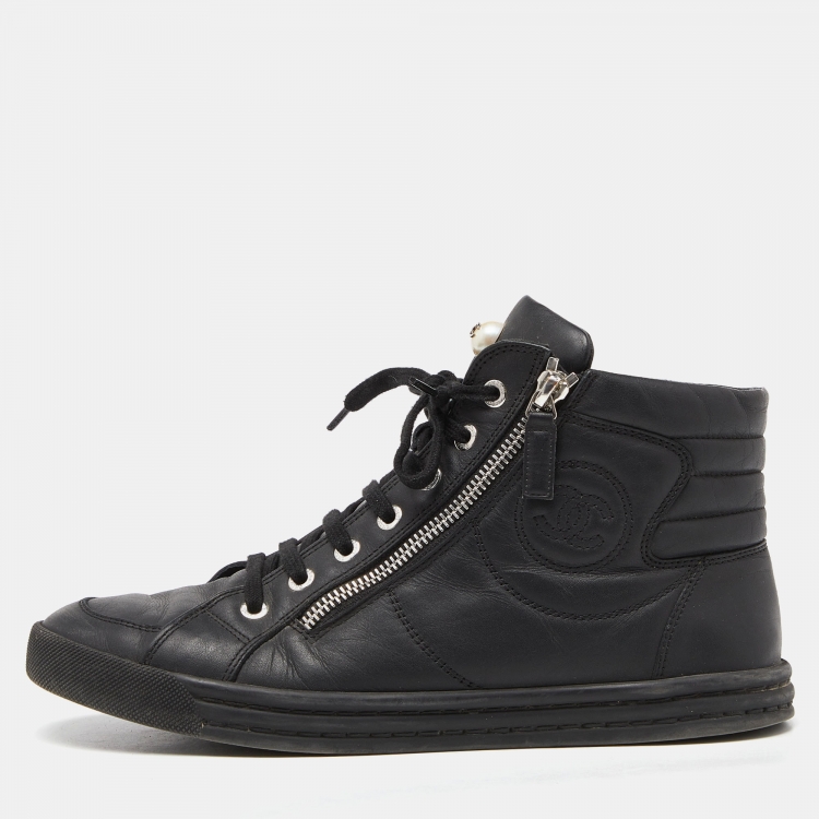 Pre Owned Chanel Black Leather CC Zip Link High Top Sneakers Size 39.5
