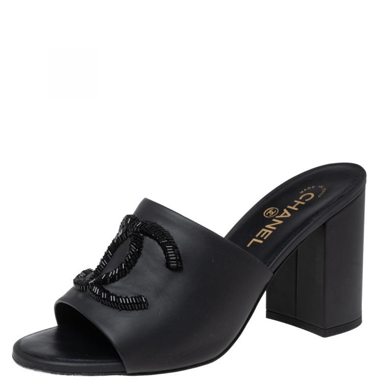 Pre Owned صندل سلايد شانيل جلد أسود مزخرف سي سي مقاس 40