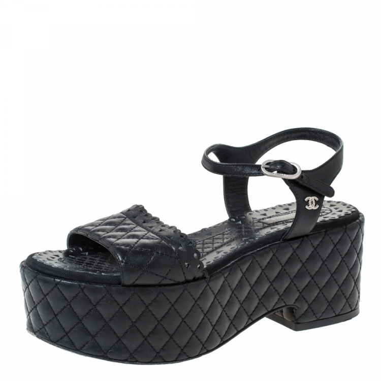 Pre Owned صندل شانيل بسير كاحل مزين بشعار الماركة سي سي و بنعل سميك جلد مبطن أسود مقاس 36