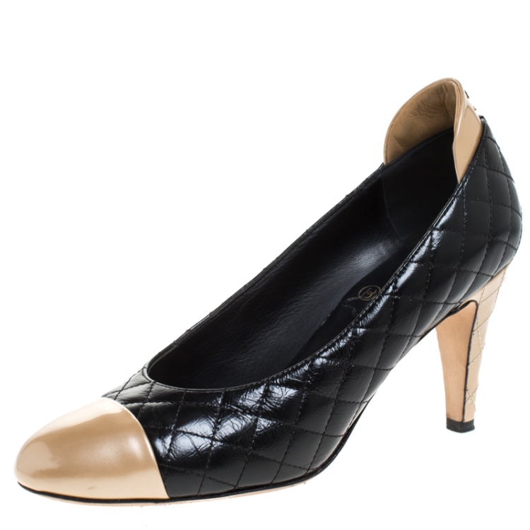مملوكة مسبقًا حذاء كعب عالي شانيل غطاء مقدمة جلد مبطن ذهبي/ أسود مقاس 37.5