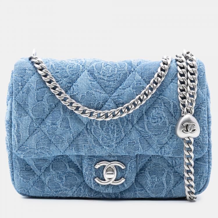 Pre Owned حقيبة شاني باللون الأزرق جينز مبطن كامليا ميني بأغطية على شكل قلب